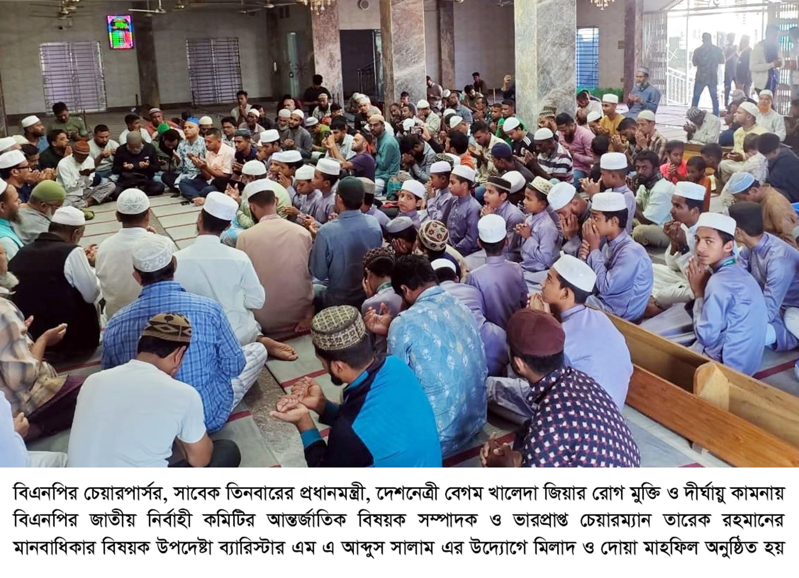 বিএনপির চেয়ারপার্সর, সাবেক তিনবারের প্রধানমন্ত্রী, দেশনেত্রী বেগম খালেদা জিয়ার রোগ মুক্তি ও দীর্ঘায়ু কামনায় এক মিলাদ ও দোয়া মাহফিল অনুষ্ঠিত হয়েছে।