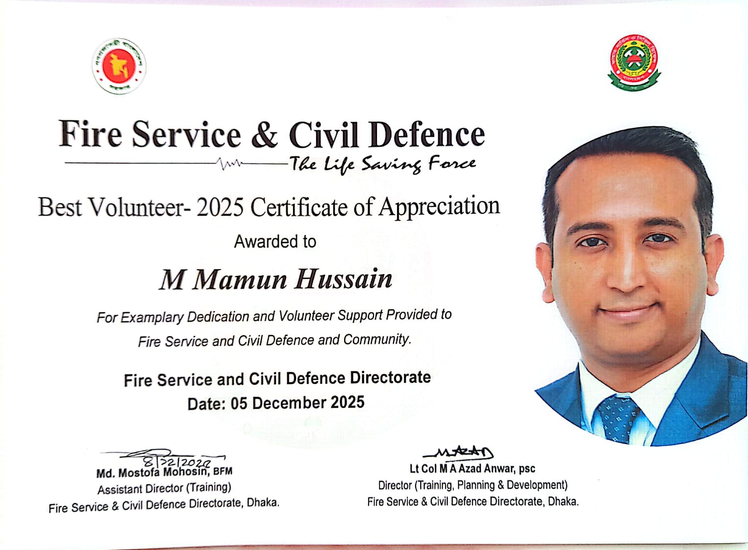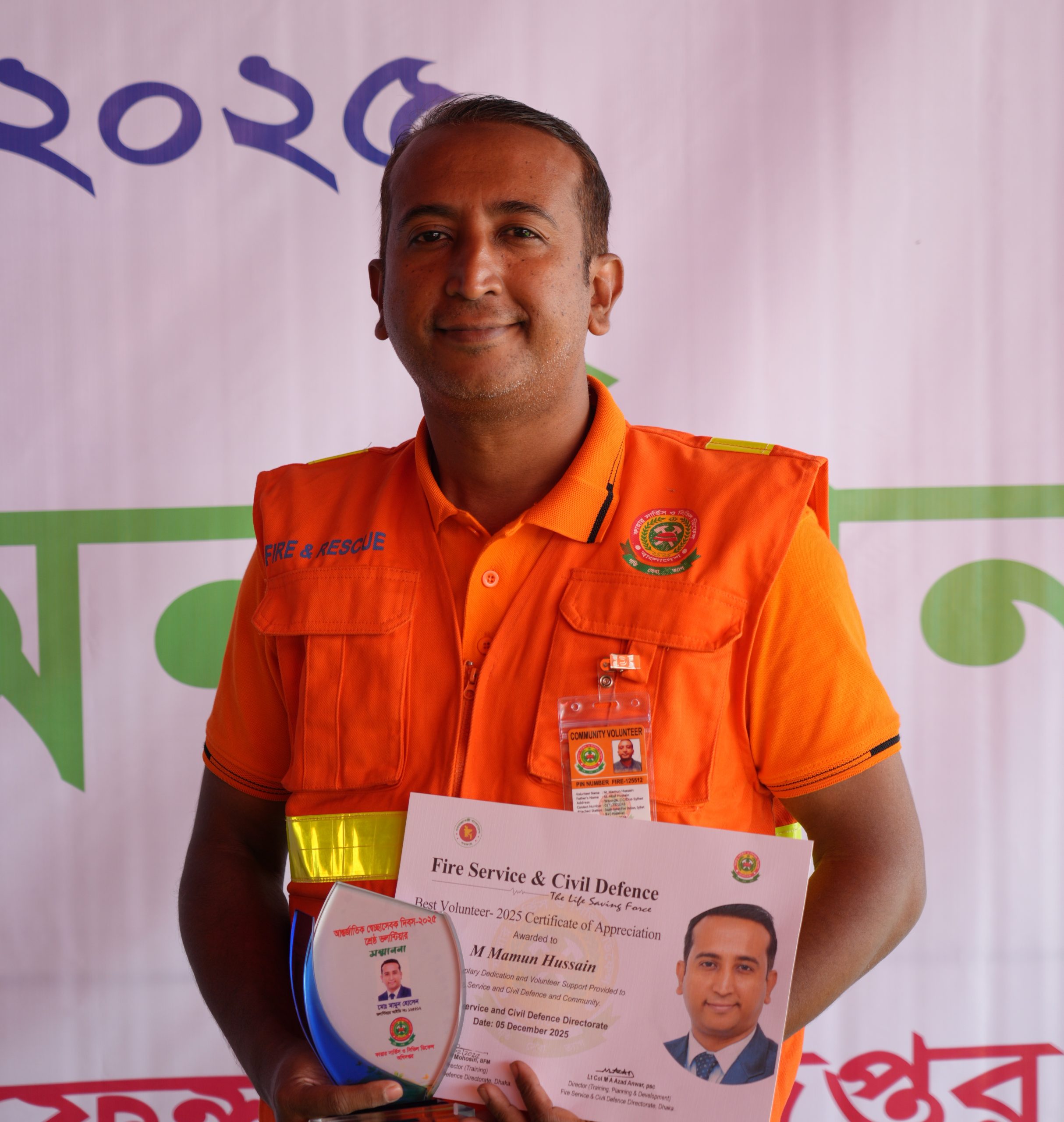 আন্তর্জাতিক স্বেচ্ছাসেবক দিবস-২০২৫ যথাযোগ্য মর্যাদায় উদযাপন করেছে ফায়ার সার্ভিস ও সিভিল ডিফেন্স। ৫ ডিসেম্বর ২০২৫ শুক্রবার নারায়ণগঞ্জের পূর্বাচলে অবস্থিত ফায়ার সার্ভিস ও সিভিল ডিফেন্স মাল্টিপারপাস ট্রেনিং গ্রাউন্ডে দিনব্যাপী নানা আয়োজনের মধ্য দিয়ে অনুষ্ঠিত হয় এই কর্মসূচির মাধ্যমে তিনি দেশসেরা সেচ্ছাসেবকের পুরুস্কার গ্রহণ করেন।। অনুষ্ঠানের প্রধান অতিথি ছিলেন স্বরাষ্ট্র মন্ত্রণালয়ের মাননীয় উপদেষ্টা লেফটেন্যান্ট জেনারেল মোঃ জাহাঙ্গীর আলম চৌধুরী (অব.)। বিশেষ অতিথি ছিলেন মাননীয় প্রধান উপদেষ্টার বিশেষ সহকারী জনাব মোঃ খোদা বখস চৌধুরী। ফায়ার সার্ভিস ও সিভিল ডিফেন্স অধিদপ্তরের মহাপরিচালক ব্রিগেডিয়ার জেনারেল মুহাম্মদ জাহেদ কামাল, এনডিসি, এএফডব্লিউসি, পিএসসিসহ স্বরাষ্ট্র মন্ত্রণালয় ও ফায়ার সার্ভিস অধিদপ্তরের ঊর্ধ্বতন কর্মকর্তারা অনুষ্ঠানে উপস্থিত ছিলেন।